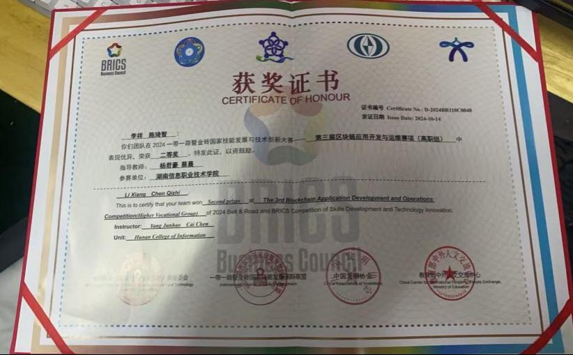 2024年一带一路暨金砖国家技能发展与技术创新大赛第三届区块链应用开发与运维赛项(高职组)二等奖