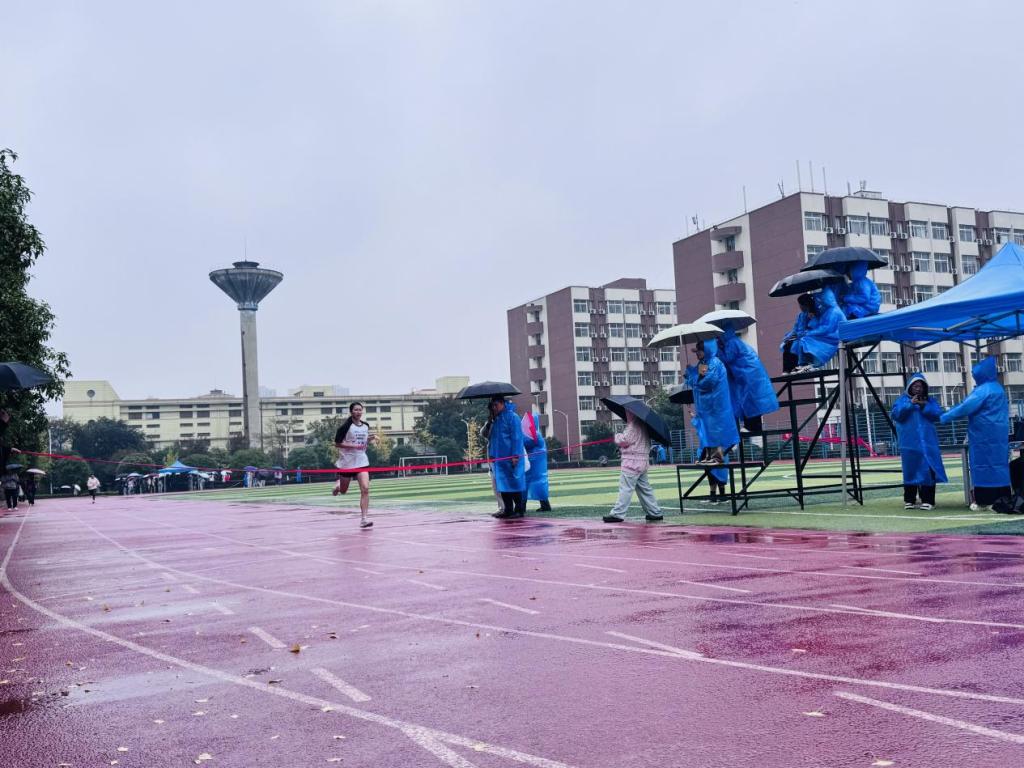 比赛依始,天空飘起淅沥沥沥的小雨,雨水未浇灭运动的热情,反而激发了师生们的斗志。“风雨无阻”不再是口号,而是赛场上最真实的写照。跑道上,运动员们迎着雨点奋力冲刺,每一步都踏出水花,踏出坚韧,用实际行动诠释体育精神的内涵。田赛场上,湿滑的场地增加了挑战,每一次投掷、每一次跳跃都更加全力以赴。铅球赛场更是打破了学院运动会记录,不畏艰难、坚持到底的体育精神熠熠生辉。