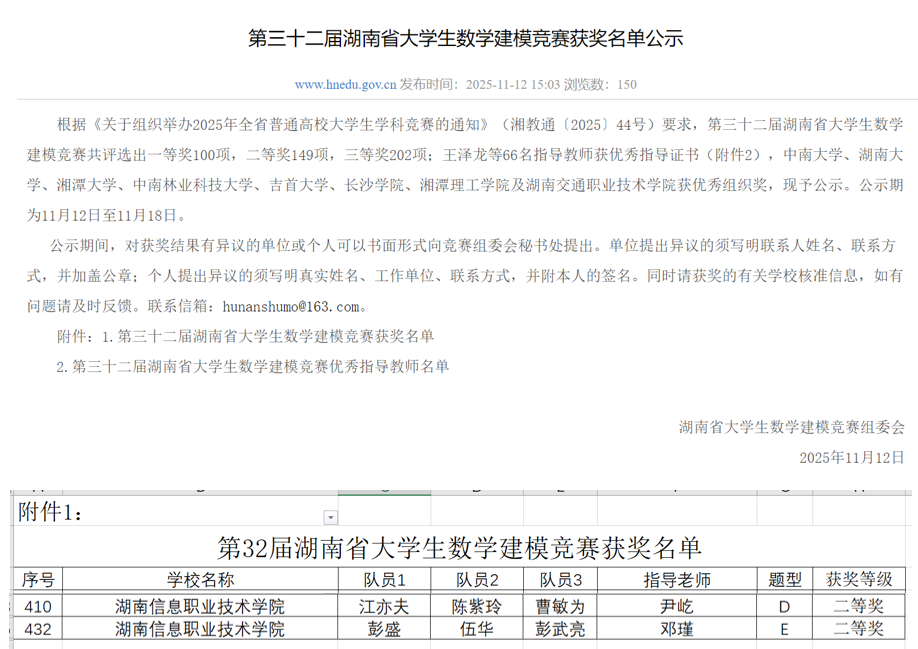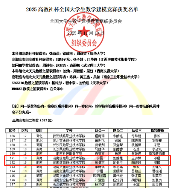 由区块链专业李雯、刘姝婕、王诗婷组成的D题“矿井突水逃生”参赛队和由人工智能专业彭儒杰、胡长平、计网专业向继凤组成的E题“AI智能体测”参赛队,凭借创新性的解决方案与扎实的建模能力,荣膺全国高职高专组二等奖。由机械设计与制造专业江亦夫、陈紫玲、曹敏组成的团队和由软件工程专业彭盛、伍华、彭武亮组成的团队表现亮眼,均斩获省级二等奖。