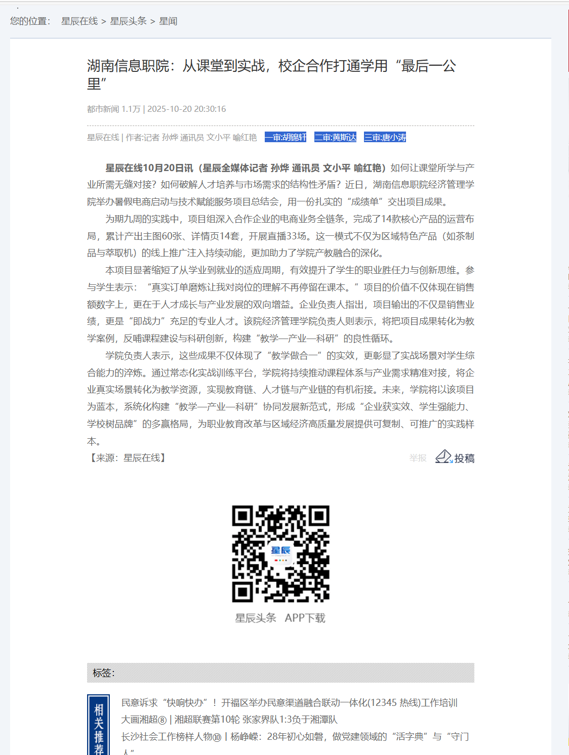10月20日,星辰在线发布《湖南信息职院:从课堂到实战,校企合作打通学用“最后一公里”》