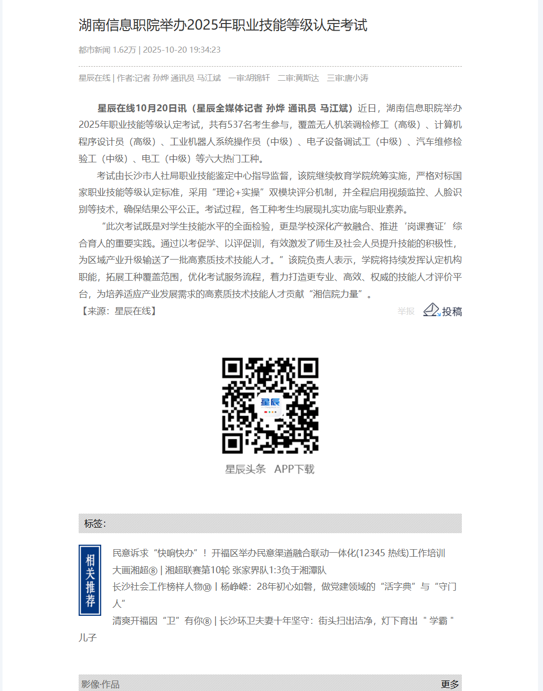 10月20日,星辰在线发布《湖南信息职院举办2025年职业技能等级认定考试》