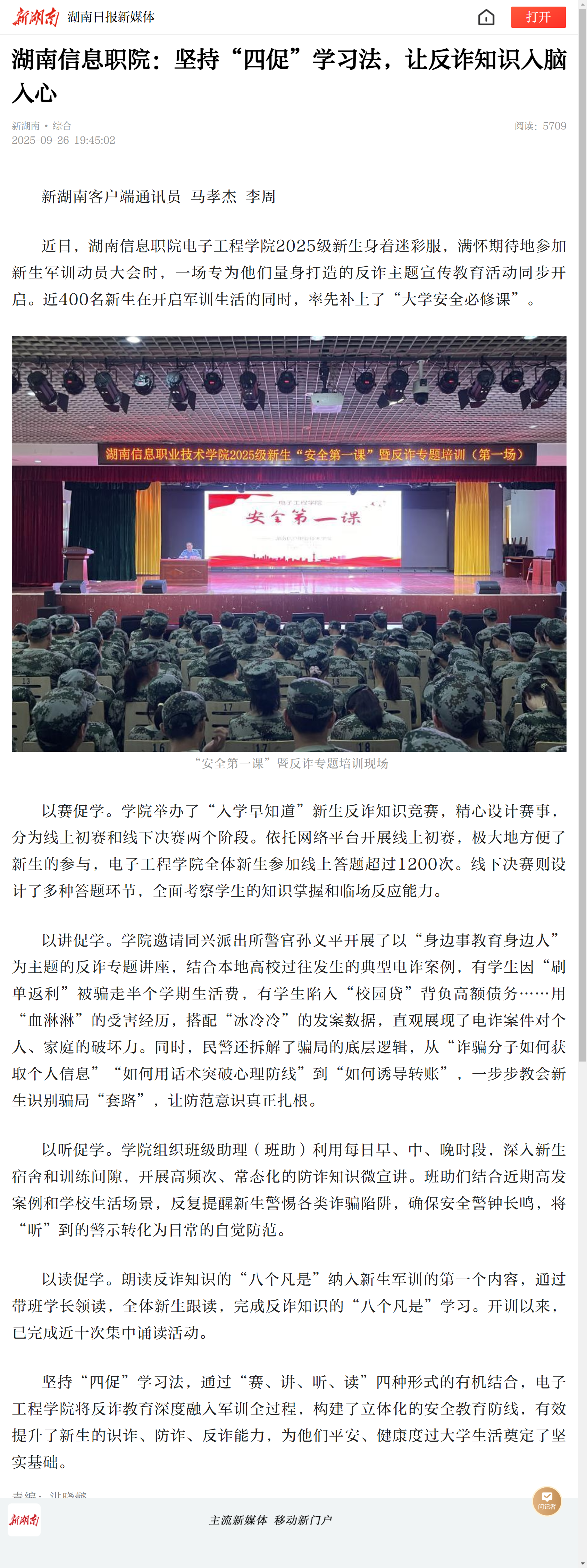 9月26日,新湖南发布《湖南信息职院:坚持“四促”学习法,让反诈知识入脑入心》