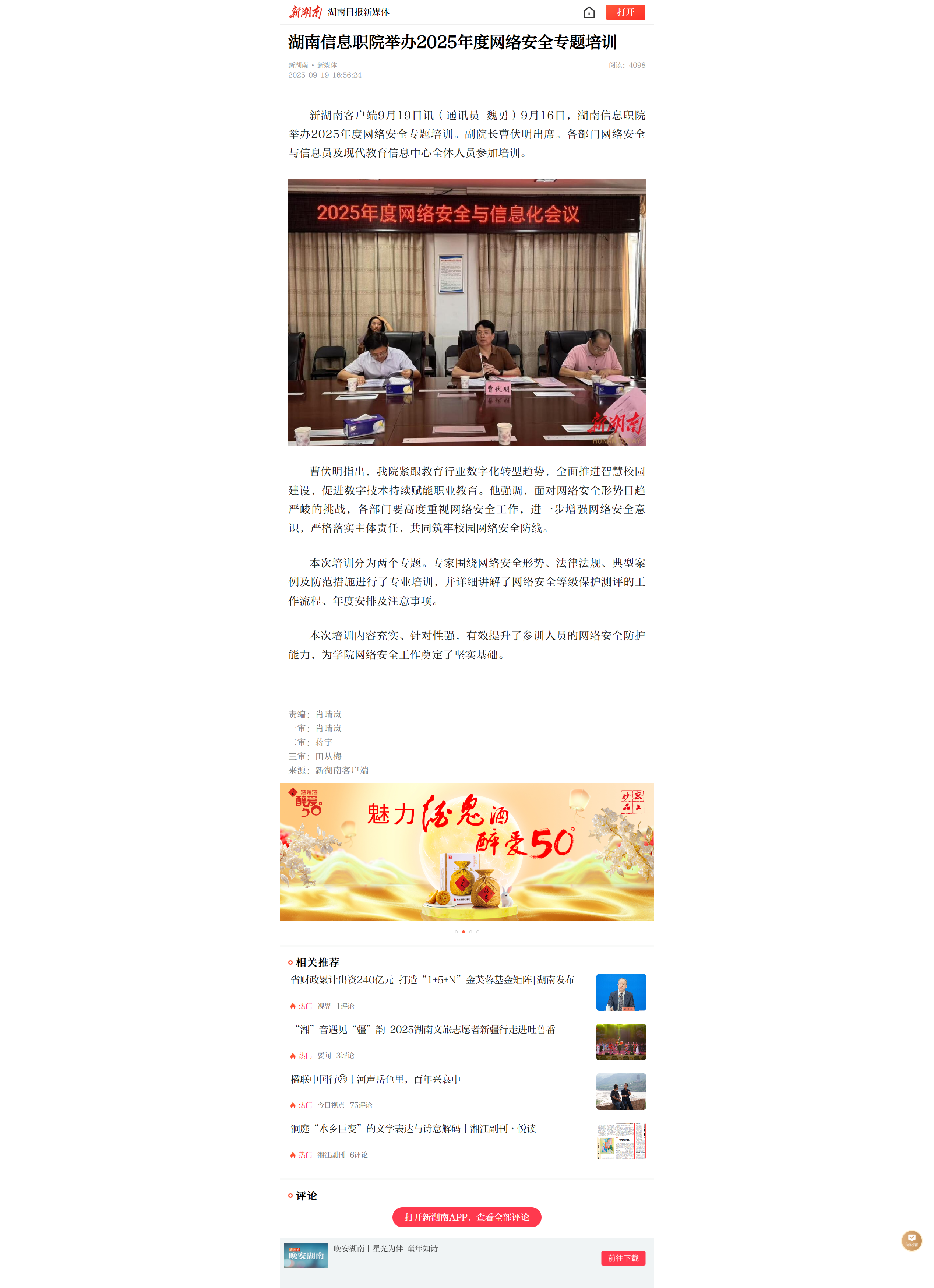 9月19日,新湖南发布《湖南信息职院举办2025年度网络安全专题培训》