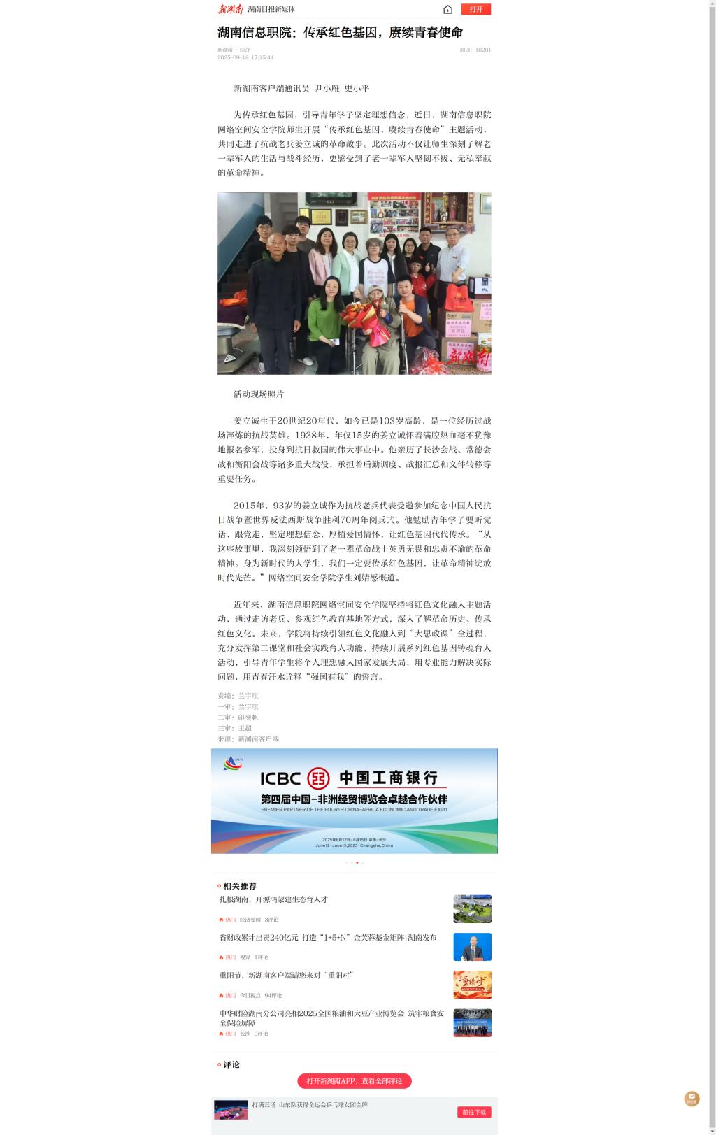 9月18,新湖南发布《湖南信息职院:传承红色基因,赓续青春使命》