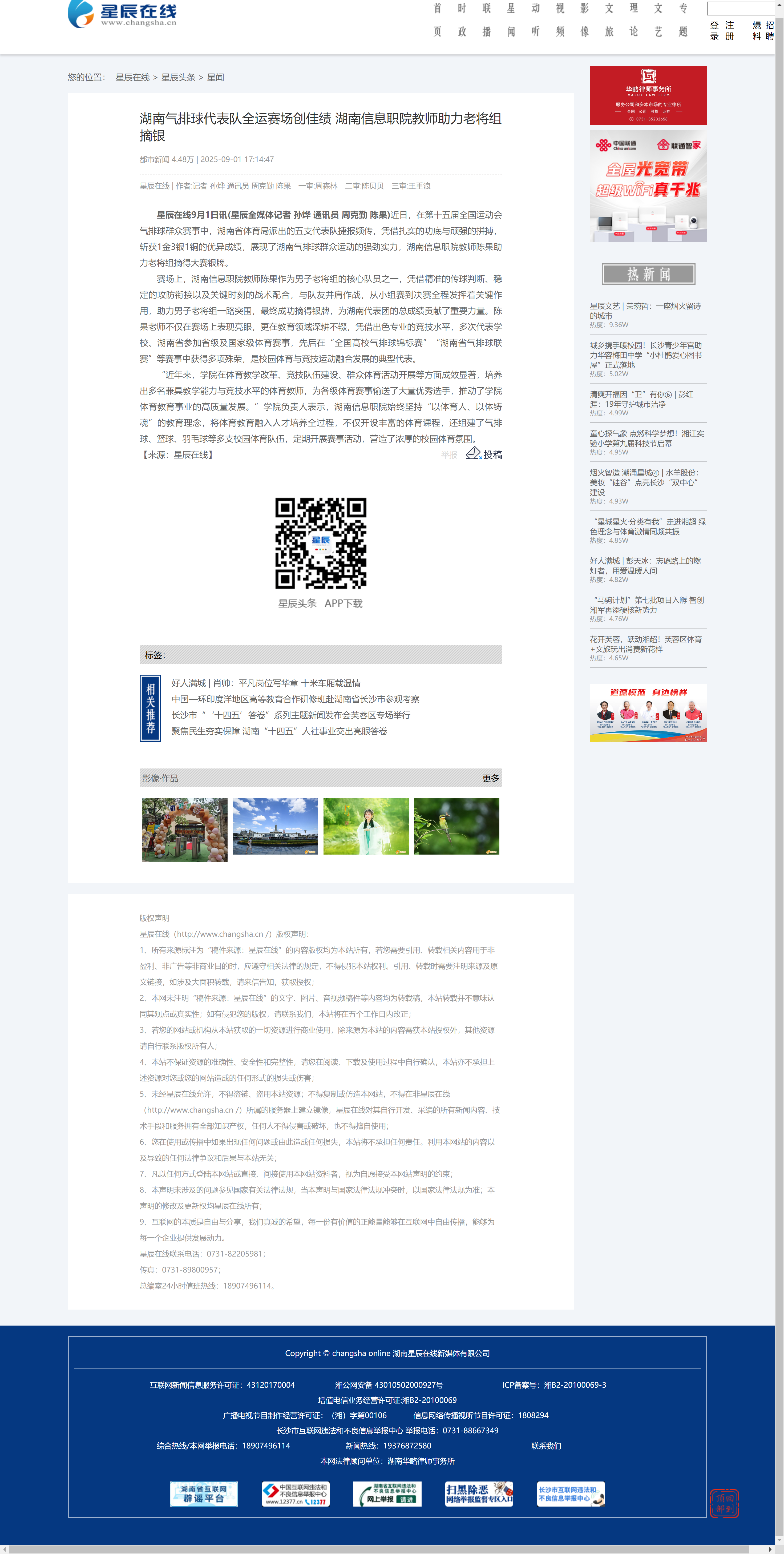 9月1日,星辰在线发布《湖南气排球代表队全运赛场创佳绩 湖南信息职院教师助力老将组摘银》
