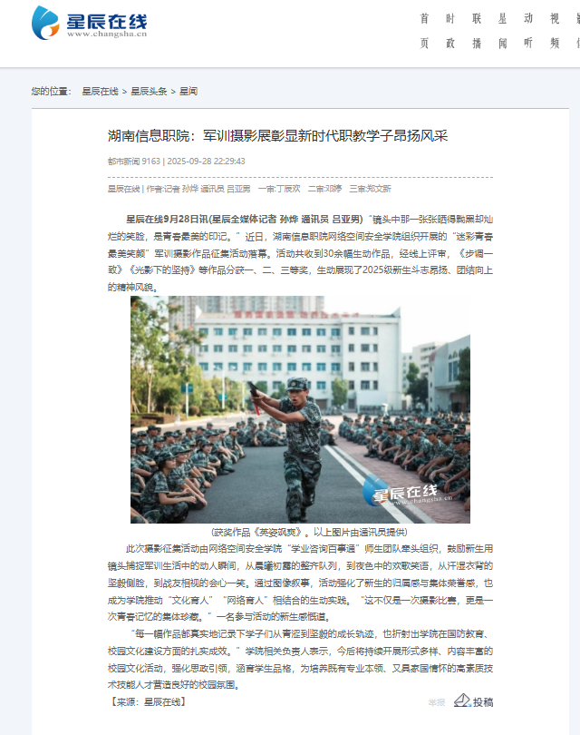 9月28日,星辰在线发布《湖南信息职院:军训摄影展彰显新时代职教学子昂扬风采》