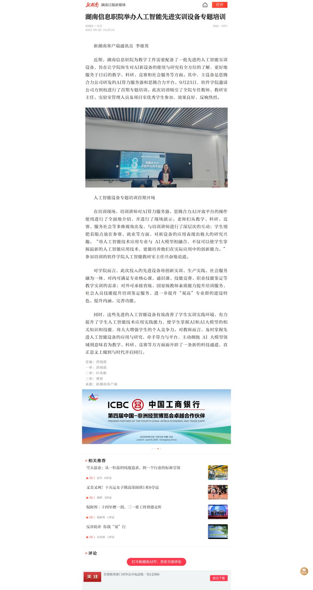 9月26日,新湖南发布《湖南信息职院举办人工智能先进实训设备专题培训》