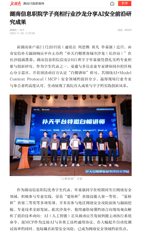 11月20日,新湖南发布《湖南信息职院学子亮相行业沙龙分享AI安全前沿研究成果》