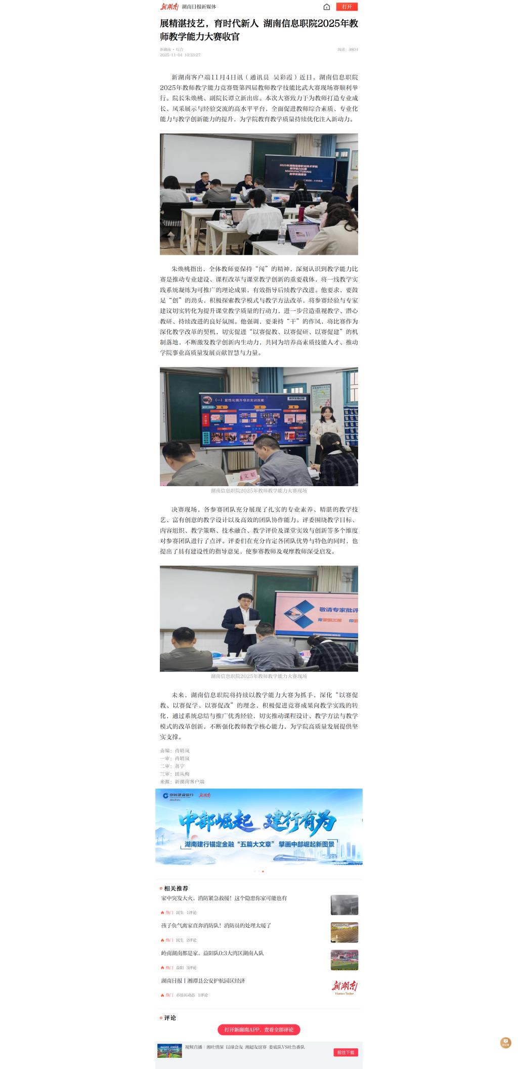 11月4日,新湖南发布《展精湛技艺,育时代新人 湖南信息职院2025年教师教学能力大赛收官》