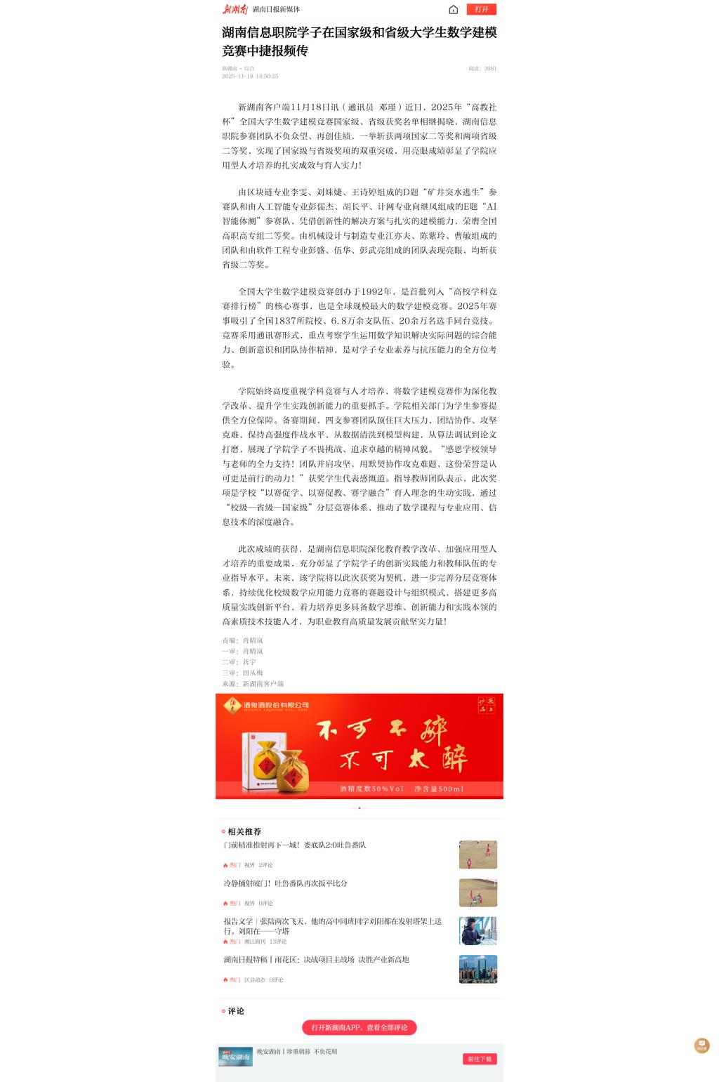 11月18日,新湖南发布《湖南信息职院学子在国家级和省级大学生数学建模竞赛中捷报频传》