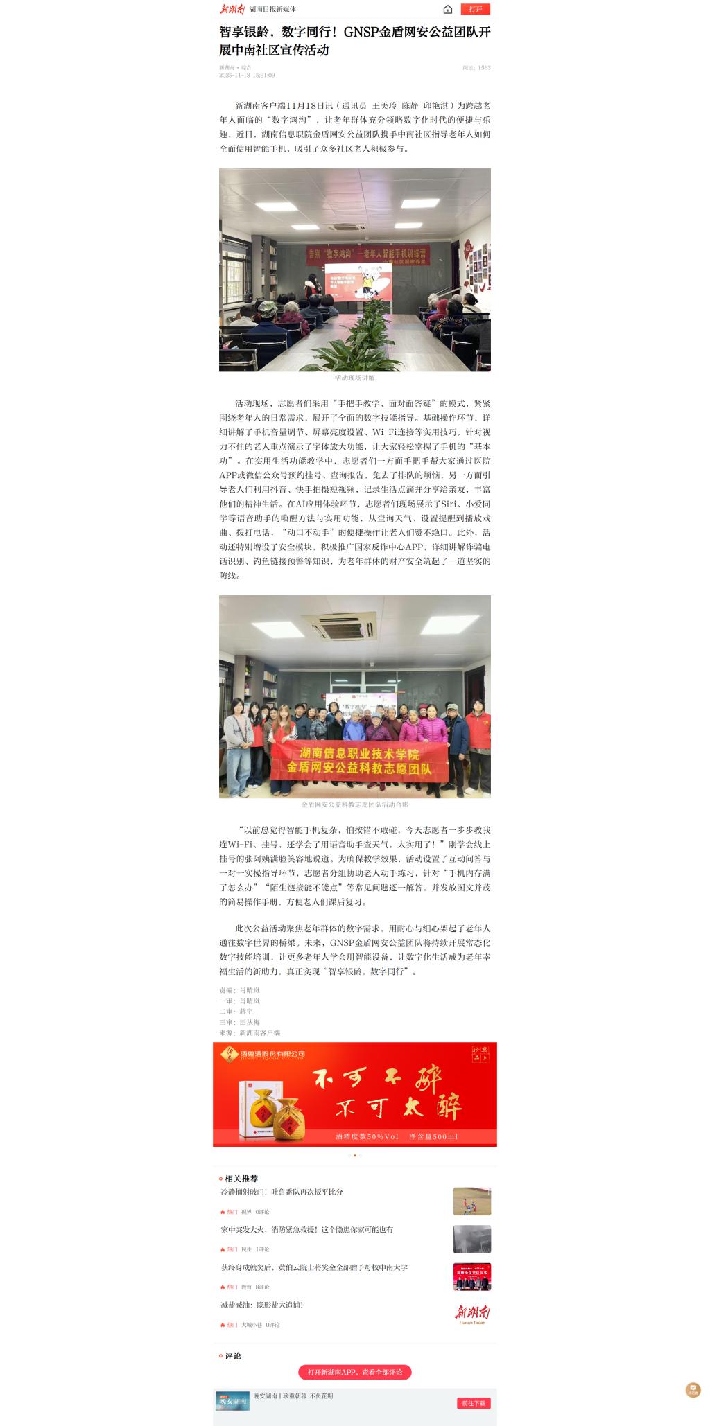 11月18日,新湖南发布《智享银龄,数字同行!GNSP金盾网安公益团队开展中南社区宣传活动》