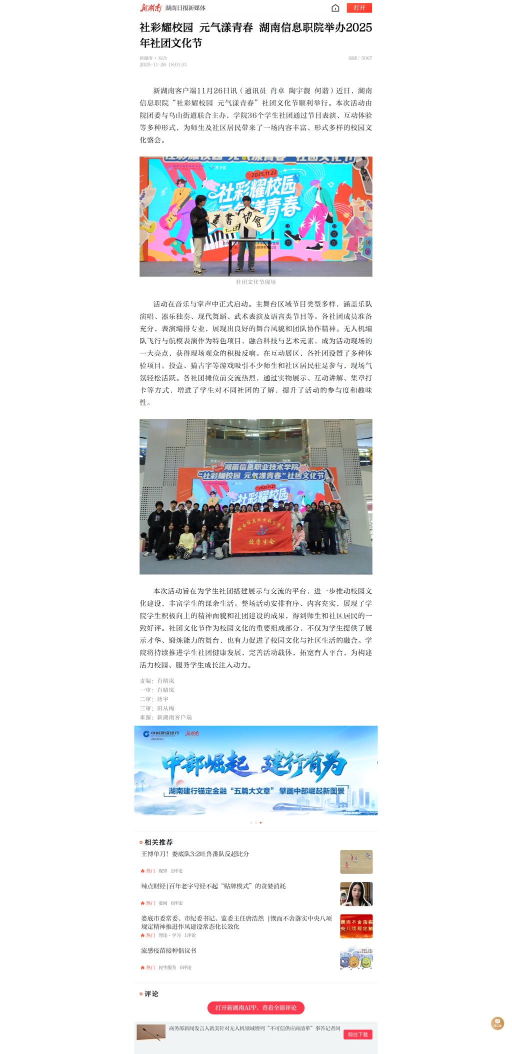 11月26日,新湖南发布《社彩耀校园 元气漾青春 湖南信息职院举办2025年社团文化节》