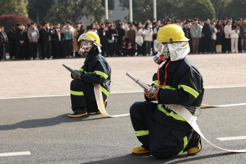 本次演练分为反恐防暴与消防应急演练两个阶段。第一阶段,通过模拟外来侵扰者闯入校园的情景,立即启动反恐预案,安保人员即刻报警并采取初步控制措施,通过与公安机关紧密配合,高效处置危机,有效保障师生的人身和财产安全。第二阶段,微型消防站设施设备操作展示,穿脱防火服、穿戴防烟面罩、操作消防水枪水带等。演练结束后,长沙市公安局望城分局巡警大队王省伟、长沙市望城区消防救援大队副大队长杨来福分别进行了点评,并强调要将演练成果切实转化为实际应对能力。