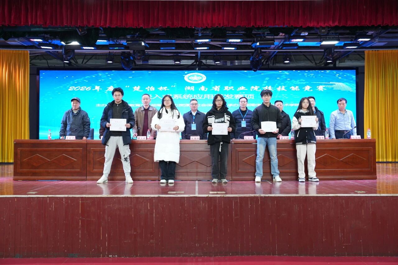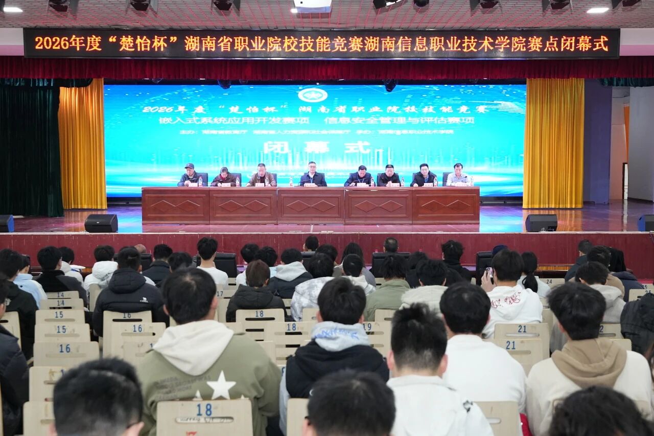2月7日,2026年度“楚怡杯”湖南省职业院校技能竞赛高职“信息安全管理与评估”和“嵌入式系统应用开发”2个赛项在我院落下帷幕。我院院长朱焕桃、副院长谭立新,省派赛点第一副主任成朝阳,省派纪律监督员曾正辉,省派赛项负责人吴德华、向钠,裁判长赵海琳等出席并为获奖团队颁奖。闭幕式由谭立新主持。