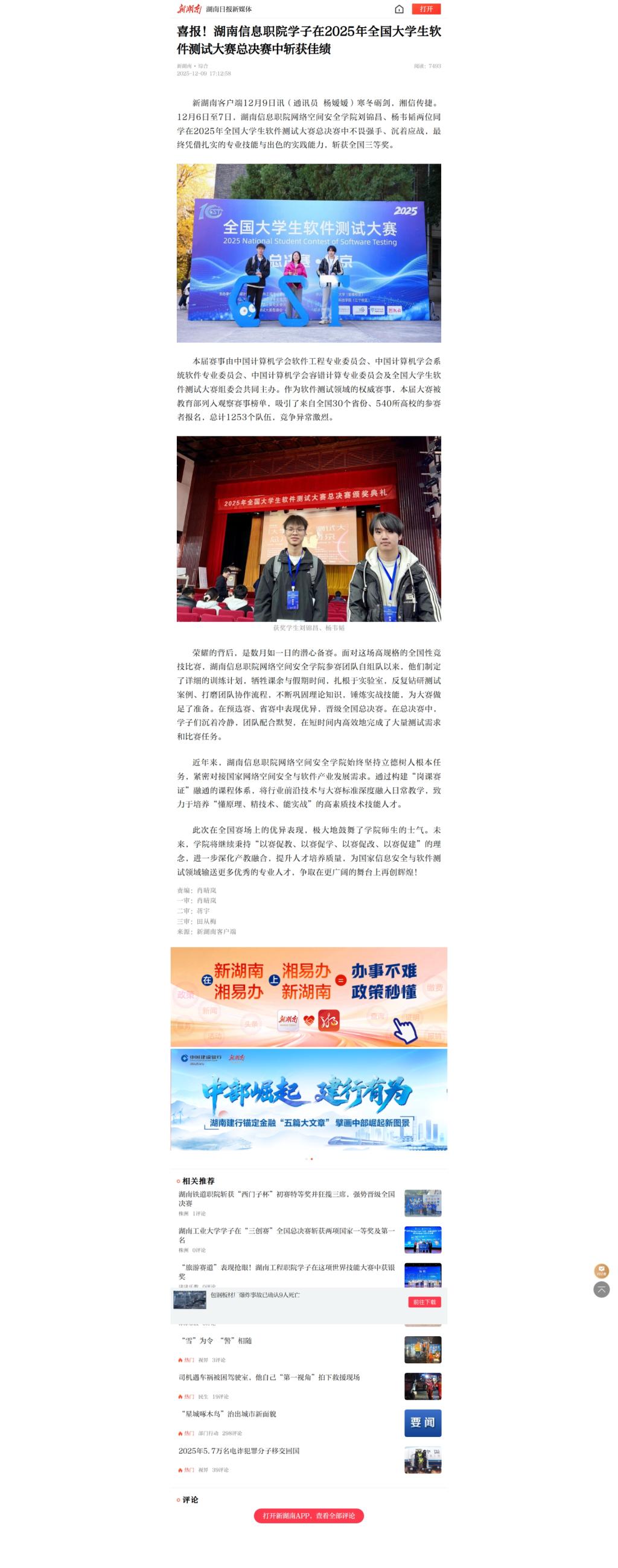 12月9日,新湖南发布《喜报!湖南信息职院学子在2025年全国大学生软件测试大赛总决赛中斩获佳绩》