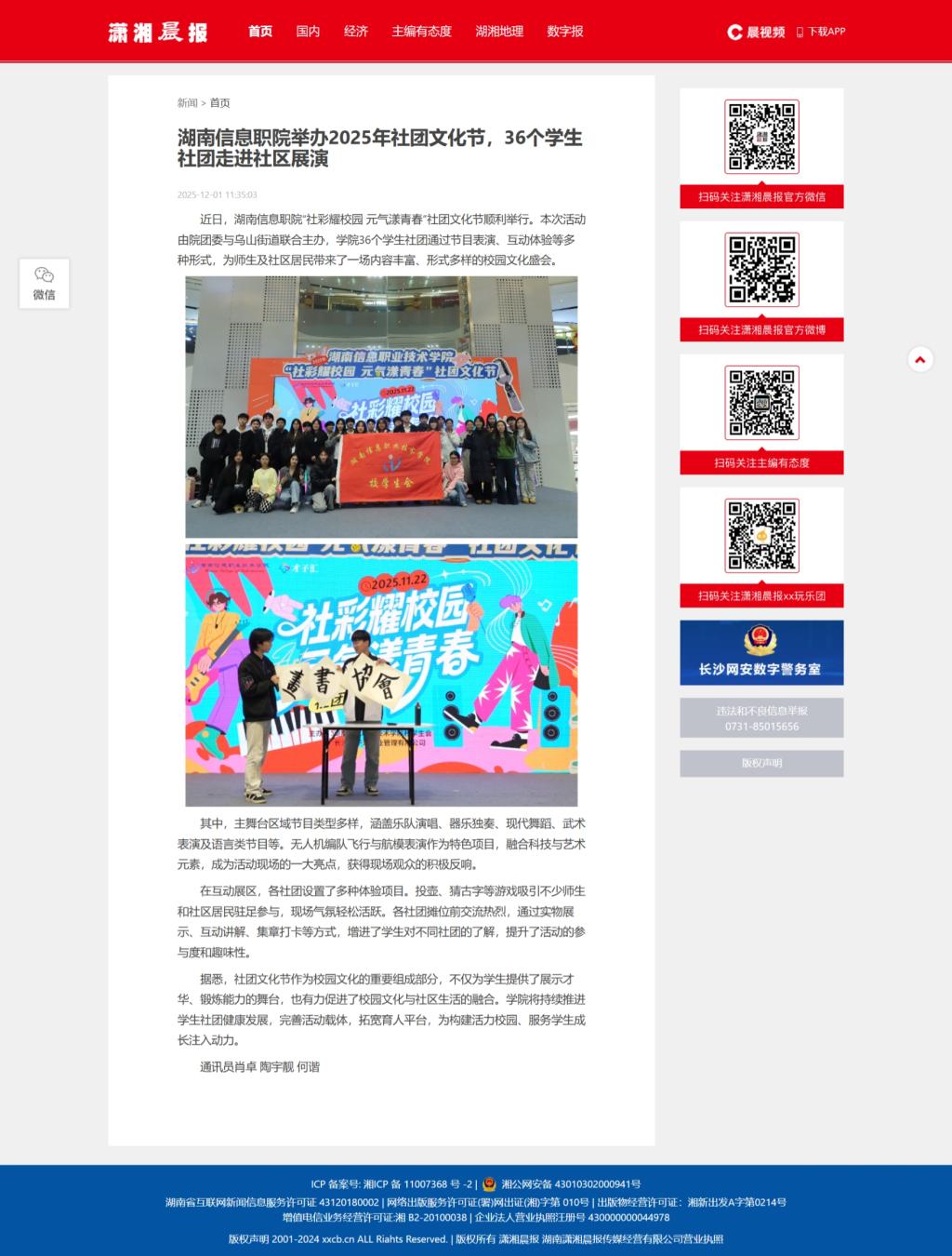 12月1日,潇湘晨报发布《湖南信息职院举办2025年社团文化节,36个学生社团走进社区展演》